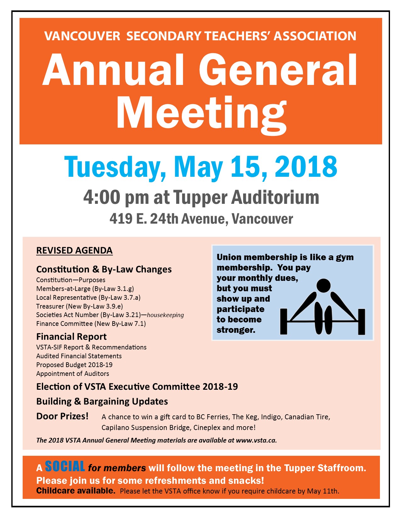 Tuesday, May 15, 2018 at 4:00pm at Tupper Auditorium. Members will receive financial reports, vote on the 2018-19 operating budget, elect the VSTA Executive for 2018-19, vote to approve by-law changes, receive updates on the the building and bargaining. Door Prizes! A chance to win a gift card to BC Ferries, The Keg, Indigo, Canadian Tire, Capilano Suspension Bridge, Cineplex and more! A social for members will follow the meeting. Childcare available – please let the VSTA office know by May 11th.