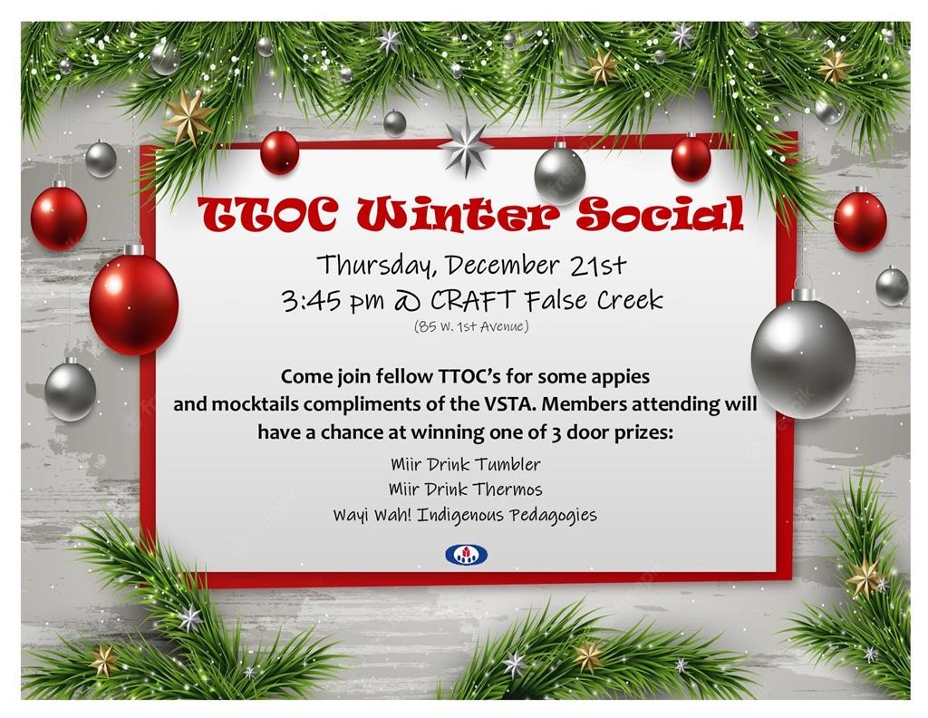 A social for Secondary TTOCs! Food and Non-alcoholic drinks provided by the VSTA. Attend to enter a draw for one of 3 door prizes!